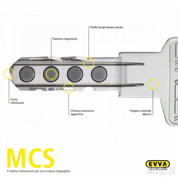 EVVA е единственият производител, който произвежда този тип висока сигурност магнитни заключващи системи. Всяка ключалка и ключ са уникални. Магнитната технология на ключа MCS гарантира най-висока защита от копиране.