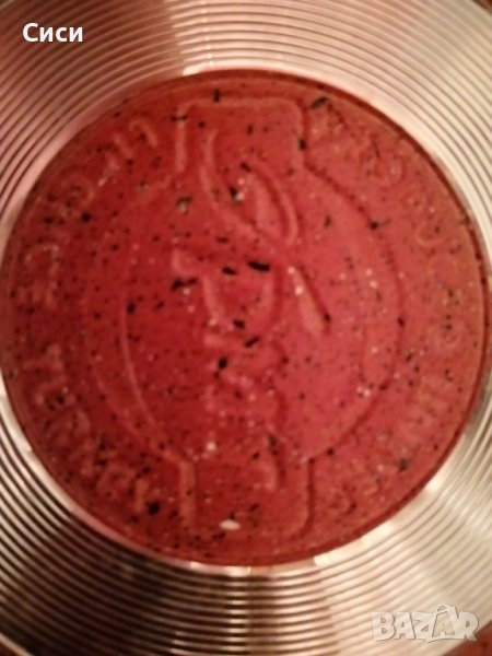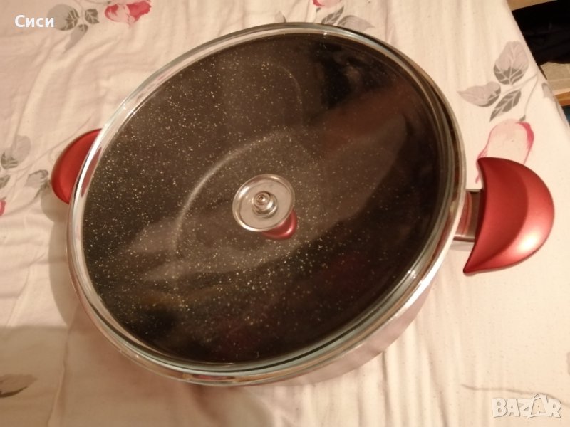Запазена. 4 мм стена Горна част 32 см. Дъно 28 см. Височина 14 см. С капак огнеупорен