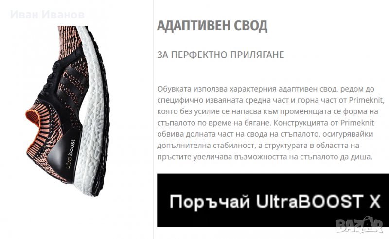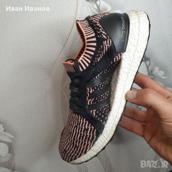 adidas Ultra Boost XGlow Orange (W)Обувани веднъж , нови , Без следи и забележки перфектни , като нови Модерни , леки и много удобни Цена по магазините над 300 лева АДАПТИВЕН СВОДЗА ПЕРФЕКТНО ПРИЛЯГАНЕОбувката използва характерния адаптивен свод, редом до специфично изваяната средна част и горна част от Primeknit, която без усилие се напасва към променящата се форма на стъпалото по време на бягане. Конструкцията от Primeknit обвива долната част на свода на стъпалото, осигурявайки допълнителна стабилност, а структурата в областта на пръстите увеличава възможността на стъпалото да диша.BOOSTБЕЗКРАЙНА ЕНЕРГИЯСредната част на подметката изцяло изработена от пяната BOOST се доказа, като най-добре осигуряваща възвращаемост на енергията,е издържлива при всякакви температури.Външната част на подметката, изработена под формата на огъваща се във четири посоки мрежа от гума Continental, е проектирана за дамската походка и осигурява добро сцепление за бягане в града при всякакви метеорологични условия.ltraBOOST X е върховото постижение на adidas в спортните обувки за жени. Те се напасват по уникалната форма на дамското стъпало и са проектирани да помагат на жените да стават по-добри с всяко следващо бягане.Уникалният дизайн на UltraBOOST X отразява естествения силует на дамското стъпало по време на бягане, за да подобри представянето с всяка крачка. Характерният адаптивен свод, редом до специфично изваяната средна и горна част от Primeknit, която без усилие се напасва към променящата се форма на стъпалото по време на тичане, осигуряват превъзходен комфорт и стабилност.За проектирането на обувката adidas Innovation Technologies са използвали системата ARAMIS - технология за проследяване на движението, която позволява детайлен анализ на движението на стъпалото. Обувката е създадена за жени с фокус върху местата, които най-много се нуждаят от стабилност по време на бягане и зоните, в които стъпало се нуждае от естествено разширение.Водещите иновации в модела UltraBOOST X са:Адаптивен свод – проектиран да следва извивката на женското стъпало и без усилие да се адаптира към променящата му се форма по време на бягане.Горна част от Primeknit – обгръща свода на стъпалото за допълнителна стабилност, а структурата в областта на пръстите увеличава възможността на стъпалото да диша.Средна част на подметката от Boost – съхранява и възвръща енергията с всяка крачка и е създадена да осигури изключителен комфорт и омекотяване.Подметката Stretch Web изработена от гума Continental – създадена за женската походка, осигуряваща добро сцепление при тичане в града, независимо от атмосферните условия.Прочети още на: https://www.dnes.bg/index/2017/08/04/adidas-predstavi-ultraboost-x-v-misteriozna-sinia-cvetova-kombinaciia.349229