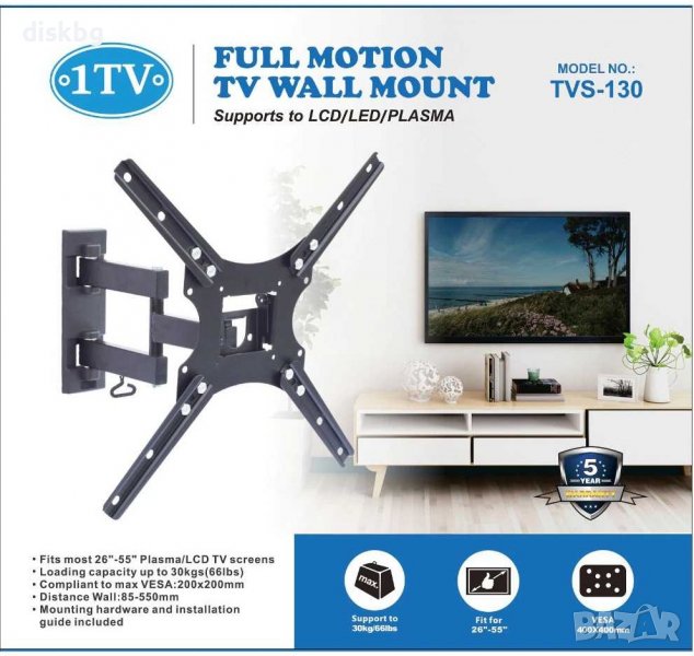 Нова метална въртяща стойка TVS-130 за LCD телевизор 26"- 55", с 2 подвижни рамена.