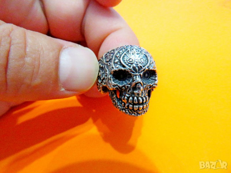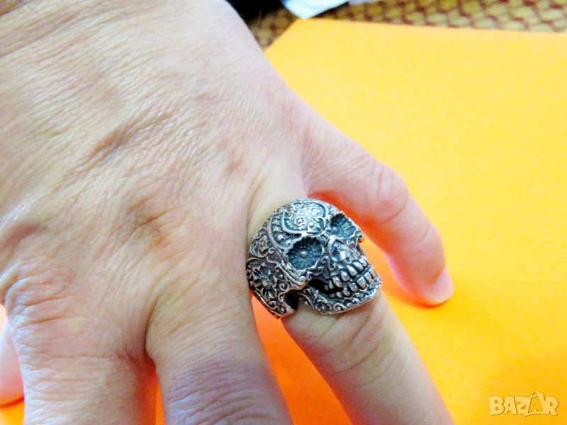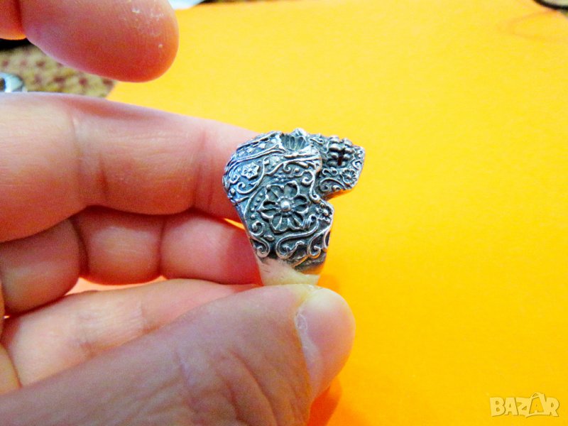 Старинен зверски солиден мъжки сребърен пръстен с Череп и цветя за пичове рокери и моторджий - Събуди звяра в теб - красота за теб и твоя мотор .