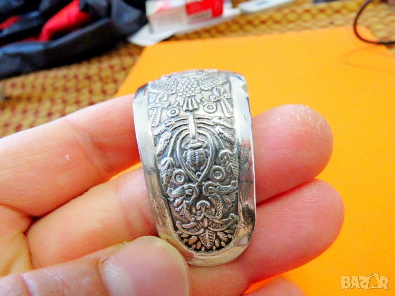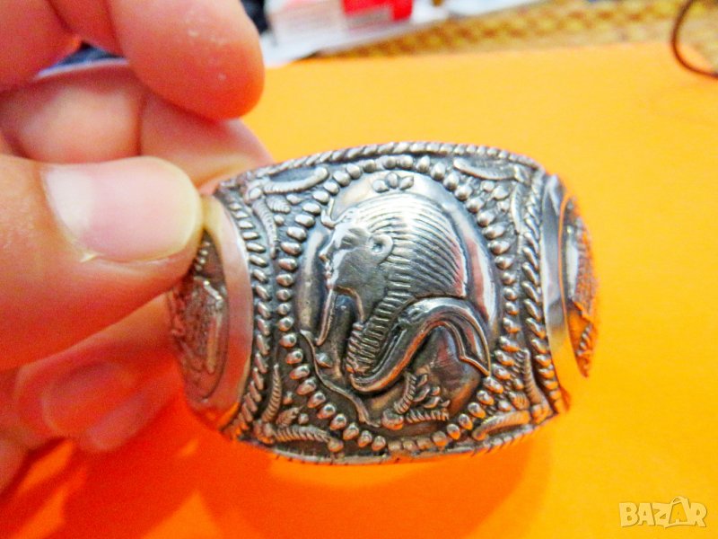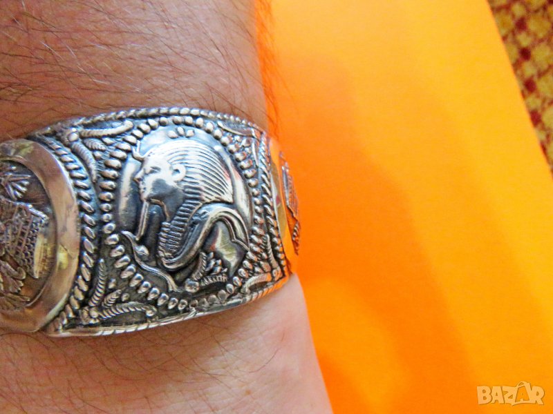 масивна кована мъжка сребърна гривна с Нефертити, Клеопатра и много египетски мотиви по нея