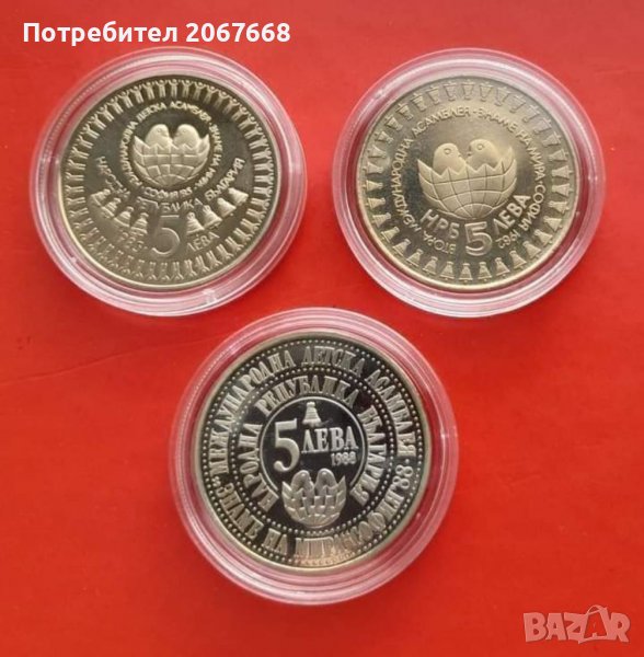 З броя монети 5 лева 1982 год. "Втора детска асамблея Знаме на мира" 5 лева 1985 година "Трета детска асамблея Знаме на мира" 5 лева 1988 година " Четвърта международна детска асамблея ".