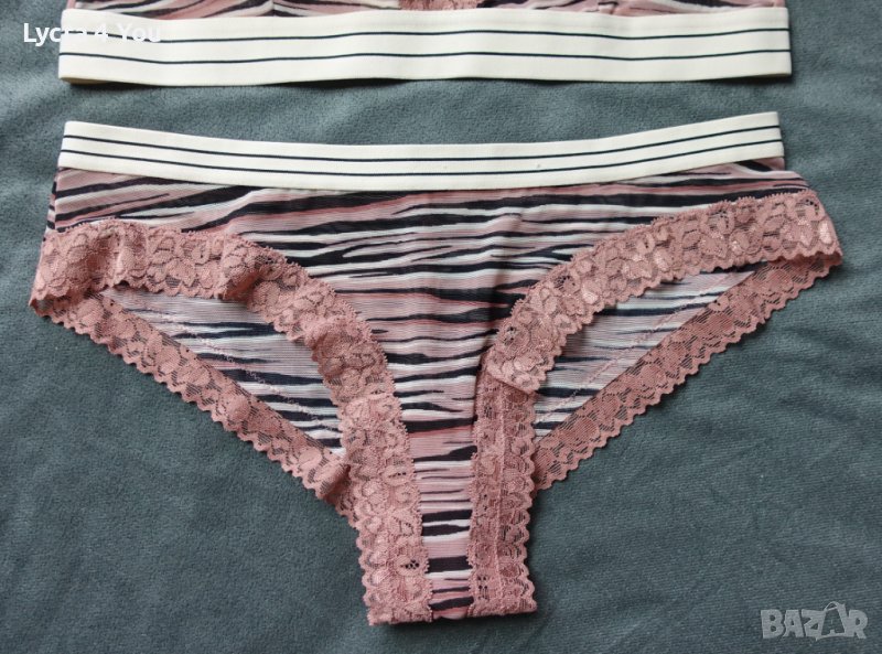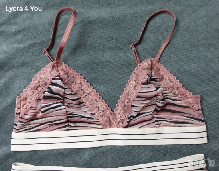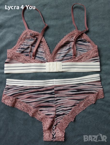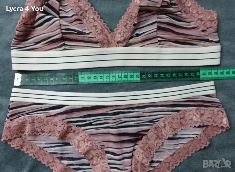 Нов (без етикет) тюлен комплект от бразилиана и сутиен/бюстие с меки чашки и ластична основа. Подходящо за S/M размер. Има измервания и мерки на снимките и на топа, и на бразилианата.
