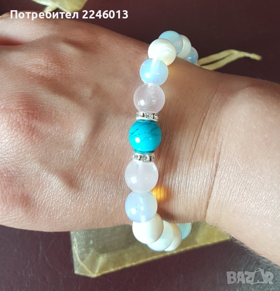 3- Третата гривна е изработена от ест.камъни Седеф.Розов кварц.Лунен камък(Опал) и топче Тюркоаз-10мм.камъни-19см.размер на гривната в нерадтегнато положение-Тюркоазът е защитен камък,особено за туристи.Смята се че тюркоазът е талисман на късмета-ще ви донесе вътрешен мир,родост и богатство.Има успокояващи ефекти за хора,които се представят публично.Розовия кварц е камък на сърцето и силната любов,безгранично спокойствие.Носи нежност.толерантност.вътрешен мир и успокоява .подходящ е при травми или кризи.привлича любов и близост-облекчава болката от загуба и помага на този който го носи да обича себе си.Помага в търсенето на подходящ паркньор и бди над семейсното щастие.Лунния камък(опал) е камък на Любовта.С негова помощ ще постигнете успехи в работата и целите,които сте поставили -добре е да се носи в напрегнати ситуации.Той е кристал на новото начало.Вярва се, че камъкът носи богатство.Подходящ за родените през октомври -цена 18лв.