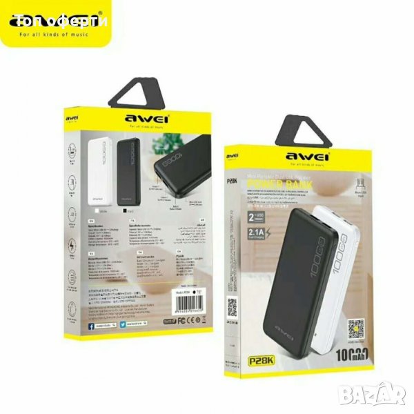 Външна батерия Awei, Модел P28K, Капацитет 10000mAh → Обява 37883832