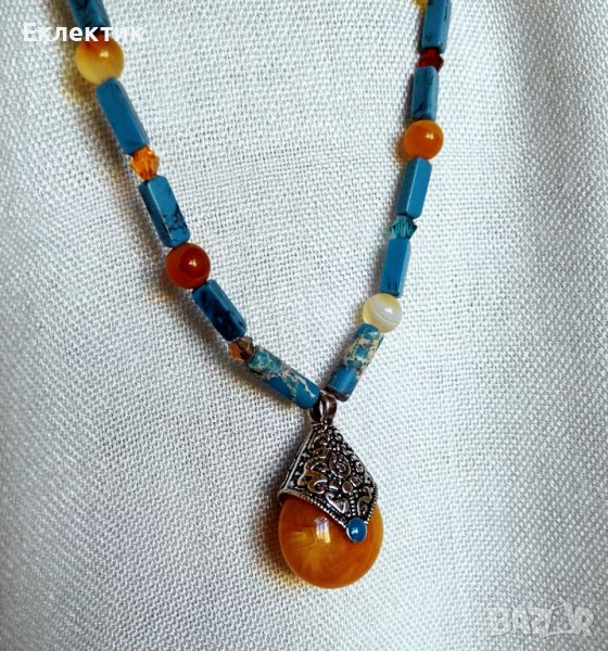 Ръчно изработени колие от тюркоазени мъниста с форма на правоъгълен паралелепипед, оранжеви кръгли 6 mm мъниста от ивичен ахат, и разноцветни синци.