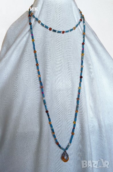 В дългата огърлица (100 см) са включени също сини мъниста от морски седимент и оранжева непалска висулка. Тя е изработена от синтетична смола във формата на водна капка и е с размери 3,6 х 2,1 см и дебелина 1,1 см; тежи 8,5 гр.