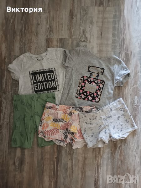 Рокля, 3 броя къси панталонки и 2 бр. блузки с къс ръкав за 7-8год, 128см. Дрешките са използвани, но са запазени. Цената е 8лв. за всичко.