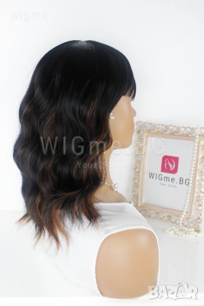 Черна перука с кестеняви кичури на вълни с бретон Дейзи