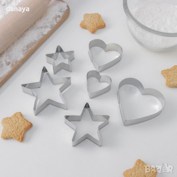 Комплектът включва 3 броя звезди и 3 броя сърца с различен размер.