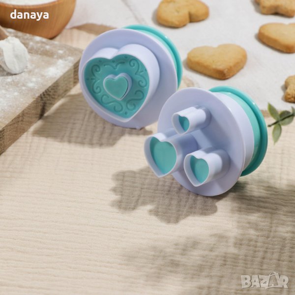 Комплект от 2 броя резци за сладки сърца. Едната форма изрязва голямо сърце, а другата 3 малки сърца в различен размер. С бутало за лесно освобождаване на тестото. Подходящи са за работа с фондан, марципан и други видове теста. Лесни за работа и почистване.