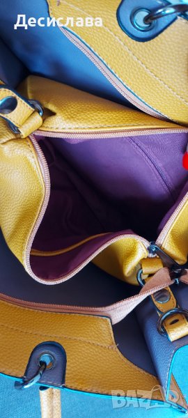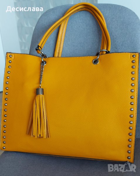 Дамска чанта в цвят горчица. С капси и висящ аксесоар. Размери в30 х ш38 см. С по-къси дръжки. Може да носи в ръка или на рамо.