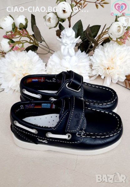 Качествени и Стилни Испански бебешки мокасини за момче, тъмно сини с бял кант и велкро.