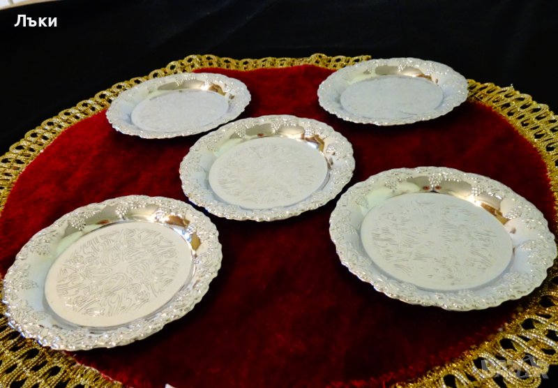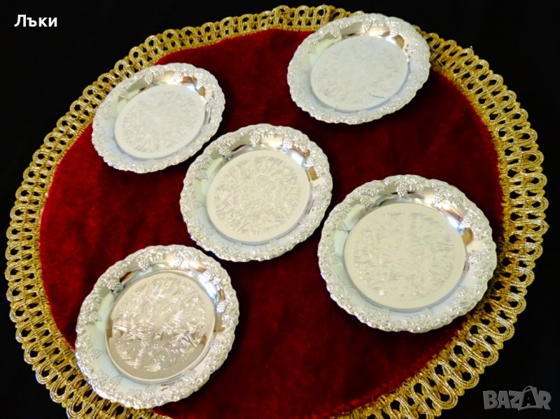 от неръждаема стомана,релефно декорирана с лози,грозде и красиви орнаменти.Диаметър 10 см.,височина 1 см.,тегло на всяка 50 гр.Налични 2 броя,цена 7 лв.,за брой.