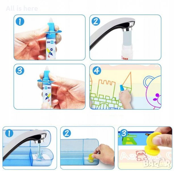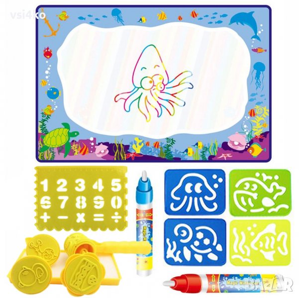 Благодарение на използването на специални, не маркиращи вода маркери, боядисването не носи риск от повреда на постелката, дрехите, мебелите или помещенията. Играта е напълно безопасна. Всичко, от което се нуждаете, е вода и дръжки, които са готови да рисуват. Магическите маркери могат да се пълнят многократно с вода; след изсушаване, постелката отново е подходяща за игра; живите цветове привличат вниманието на детето и насърчават рисуването; постелката има внимателно завършени ръбове и има интересни щампи; ви позволява да създавате рисунки в цветовете на дъгата. Постелката развива въображението и стимулира креативността; подобрява ръчните умения; използва се за научаване на рисуване, цифри, букви, форми и цветове; докато играе в група, това влияе положително на социалните и интеграционни умения и учи на взаимно сътрудничество.