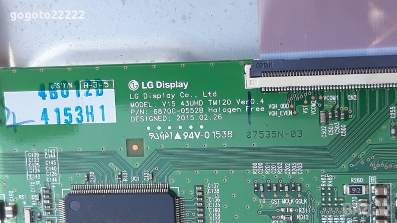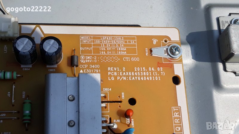 Телевизора е със счупен дисплей. Main board EAX66564303(1.1) цена 90 лева продаден. Power supply LGP43E-15UL2 цена 70 лева. T-con V15 43UHD TM120 цена 35 лева. Подсветка цена 40 лева.