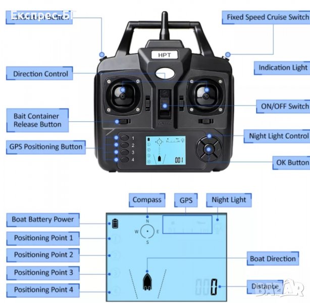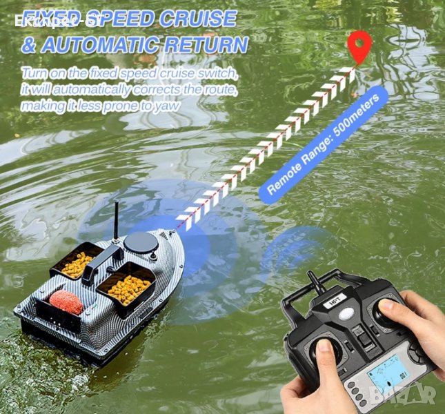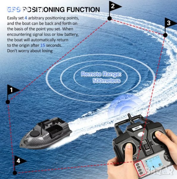 В лодката има монтиран GPS с жироскоп който я навигира изключително точно, до предварително запаметените от вас 16 точки за захранване и когато изсипете захранката и монтажа, отново навигирана от GРS-a лодката се връща сама, обратно към вас, до запаметената точка 1.