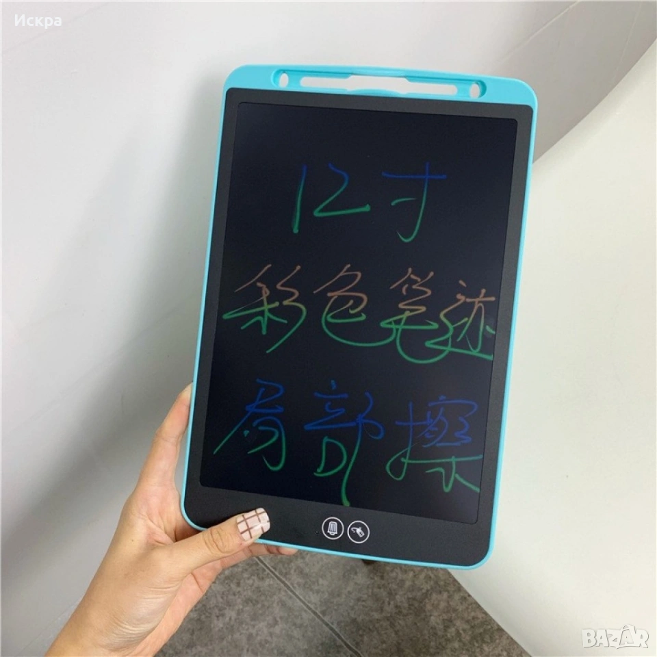 Детската дъска е снабдена с удобен и голям LCD екран с размер от 12 инча. В долната част на таблета има два бутона, които са направени по най-новата и иновативна дигитална технология. Към таблета има молив с който можете да рисувате на него. Молива е снабден с гума, за да можете много лесно и бързо да изтриете някоя част ако не ви харесва. Без да остава отпечатъци по таблета и да замазва. Създадените линии по него са с различна дебелина и зависят от степента на натиска върху екрана. Идеален начин за учене в дома или по време на път. Децата сега много лесно могат да изписват числа и думи по всяко време и на всяко място, без да създават каша на земята или стените. Таблета развива уменията и сръчността в детето. Дава му способност да мисли, да развие творческите си умения и интелект. С помощта на LCD таблета за писане и рисуване също така, могат свободно да изразяват естествените си инстинкти,като се наслаждават на рисуването или пък преброяват числата. Дъската работи с вградена йонно-литиева батерия. Удобна и лесна за използване, тя е с олекотен дизайн, което я прави лесно преносима. Използвайте я навсякъде и забравете за многото багаж, за раниците с тетрадки и безброй химикали. Подходяща е за подарък за всеки един повод. Можете да я подарите на своето дете или на близки, приятели, роднини за Коледа, Рожден ден, Имен ден и всеки един друг повод.