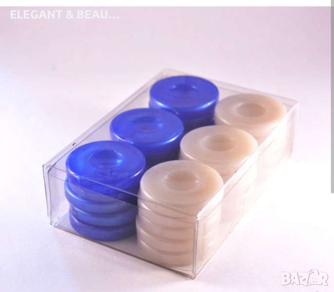 Пуловете са 30 броя, седефени, за игра на табла и дама, в различни цветове, с диаметър Ф36 мм, дебелина- 6мм,бели със зелени бели със сини или бели с червени, по избор.