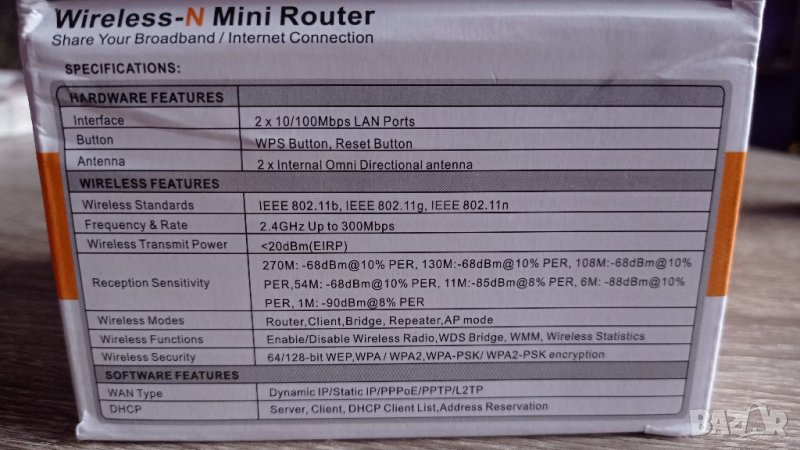 Състояние: перфектно. Все още си е със защитната лепенка, използвано е 4-5 месеца. Продава се с кутия, книжка и инструкция за експлоатация, лан кабелче. Върши перфектна работа, става като повторител! на сигнал, от друг рутер, може и за рутер да се използва, със лан кабел към рутерчето, може и да го закачите към лайфая! на вашия рутер, и да го използвате със лан кабел към лаптоп, ако примерно не поддържа лайфай лаптопа ви! Или се е повредил. Възможно е свързване към главен рутер! И разпръскване на сигнала през рутерчето като втора мрежа със ваш ник и парола! Отделно можете едновременно и през лана да ви изкарва сигнал, без да свързвате кабели! По този начин е възможно, да удължите сигнала от вашия главен рутер! Предавайки го! към мини рутерчето, и от там през лана към суич да свържете други компютри дори да нямат вграден лайфай. Ще ви свърши перфектна работа 😁 има доста функции като цяло, но си трябва и човек да знае какво прави! Спецификации на снимките. Обявата е само за София! И лично предаване. При интерес ми пишете, оставете си номер за връзка 📲 и ще се свържа с вас. Пак казвам рутерчето има доста функции, но! Трябва да знаете какво правите. 😉 Това не е просто репитър, повторител на сигнал, който не разбира! Предимно за това ще го използва.