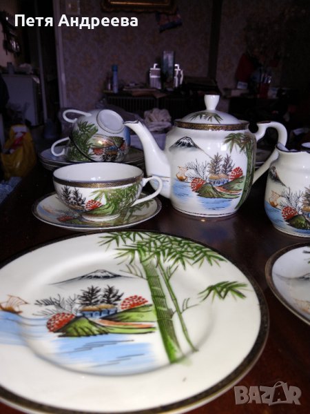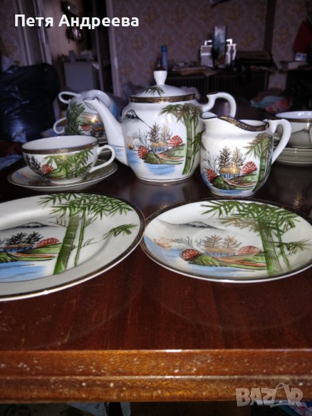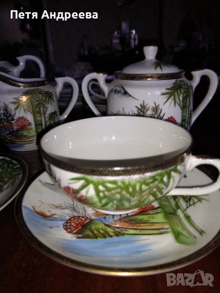 Фин японски порцелан, почти с дебелината на яйчeна черупка. На дъното на чашите има релефна глава на гейша. Шарки: бамбуково дърво и селски пейзаж в подножието на планината Фуджи. Сервизът включва чайник с капак, захарница, каничка за мляко, 6 чаши за чай, 6 чинийки, 6 по-големи чинии за десерт. Вместимост на чашата 240 мл. Неизползван, стои във витрина за красота.