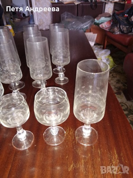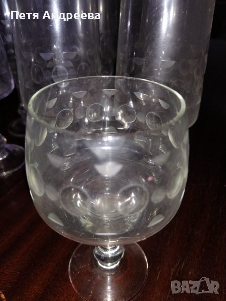 Елегантен сервиз от 12 чаши за ракия, 11 ниски чаши за червено вино или коняк и 11 високи чаши за бяло вино или бира. Високо столче с топче в долния край. Шарки като шевица - 2 реда триъгълничета и между тях кръгчета.