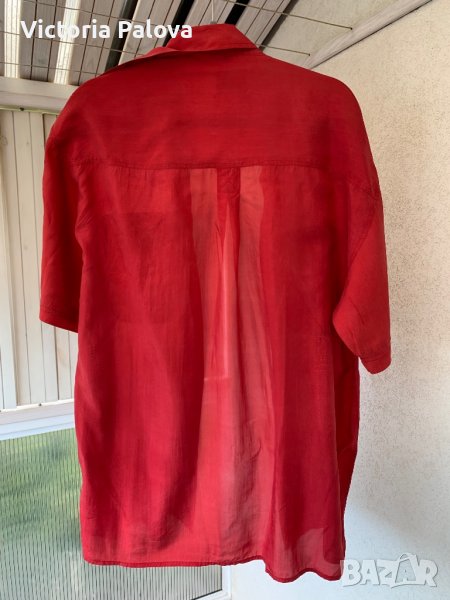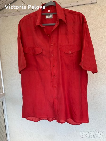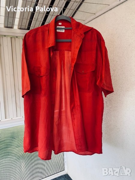 Красива риза,100% тънка нежна коприна.с груби дънки ще стои много актуално и модерно.с мъжко закопчаване е,но може да се ползва и от жени.рамене-54-55см,ГО-60-62см,дължина отпред-78см,отзад-82см.