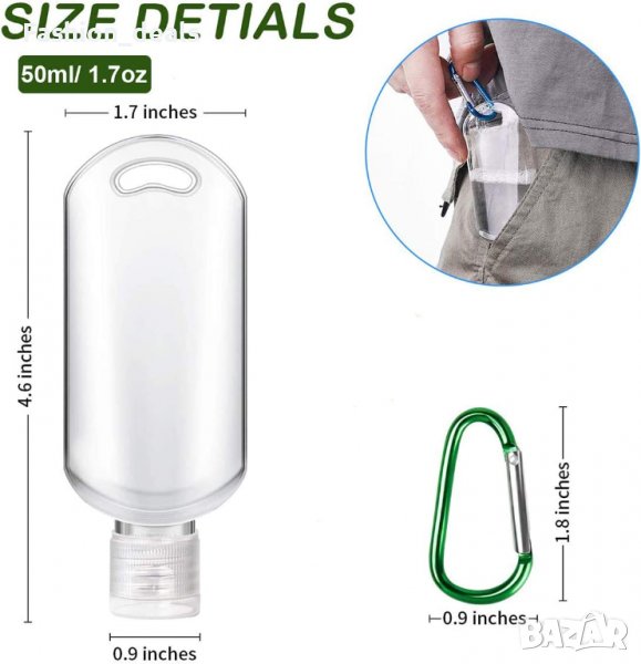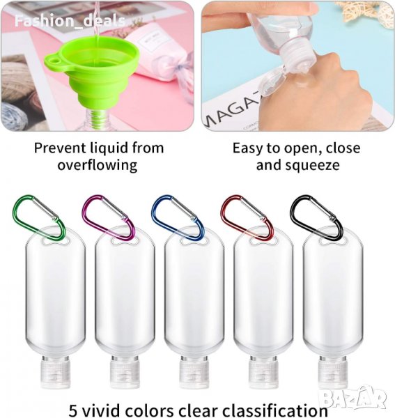 Бутилки за пътуване 50мл 8 броя + фуния и карабинери за закачане за козметика → Обява 37959341