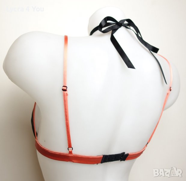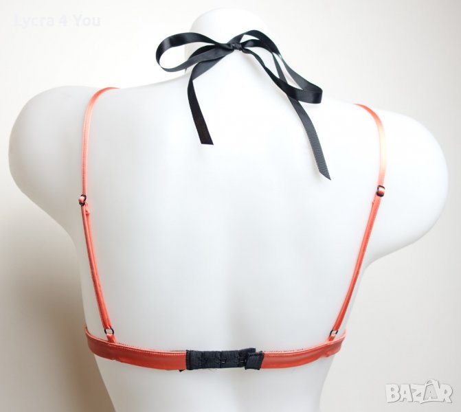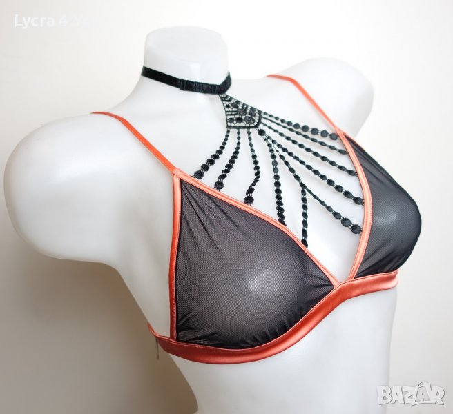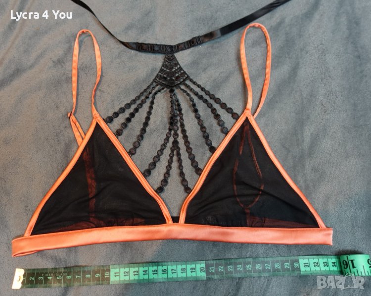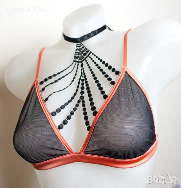 Като нов (само пробван) уникален прозрачен сутиен/топ с меки чашки от черен еластичен тюл, оранжевите елементи са от сатен, и много красив чокър, който се завързва зад врата със сатенена лента.