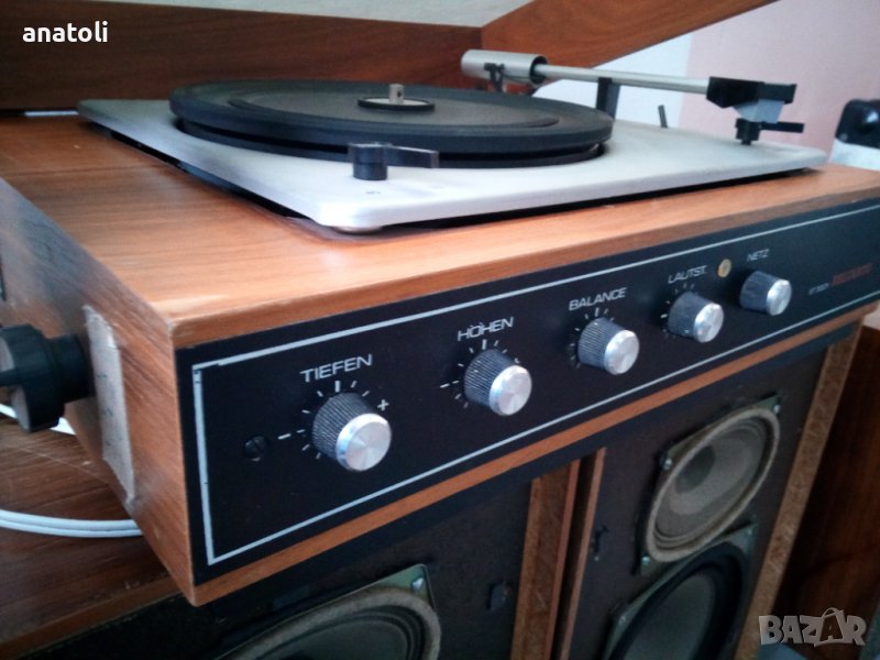 Много добро външно състояние ,вграден усилвател със германиеви транзистори 2х8 вата дозата и иглата са си там ,колонките ряботят отлично Tesla ARE667 говорители елипса ,грамофона тръгва но няма звук чува се иглата свири усилвателя работи и на двата канала много качествен звук без пукащи потенциометри свири като 2х20вата ,продава се във състоянието във което е ,внесен от германия, производител veb-rft 1974год.