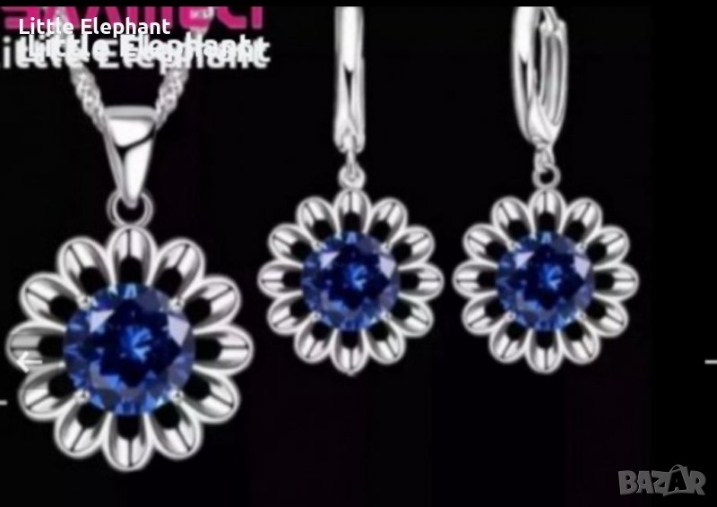 Сребърно колие с ланче цвете,dark blue/Сребърни висящи обеци цвете с кристали,dark blue/нови → Обява 37964393