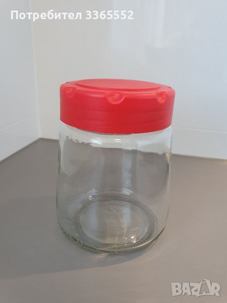 Стъклени буркани с червени пластмасови капачки. Вместимост около 500 мл. Наличност 2 броя. Продават се в комплект. Цена 6 лв.