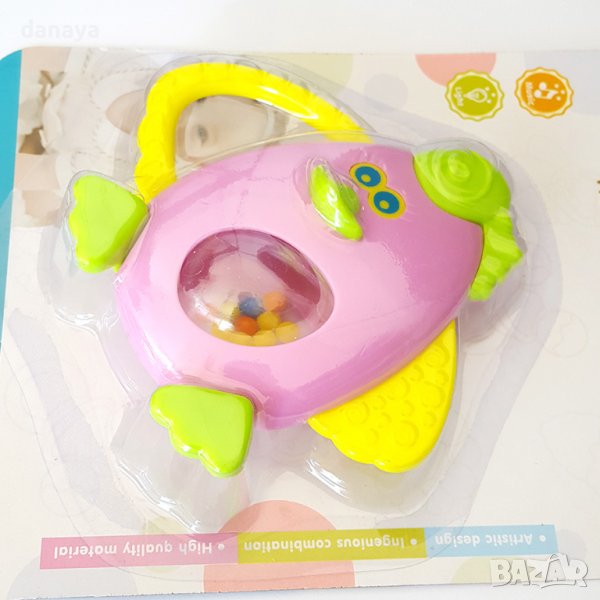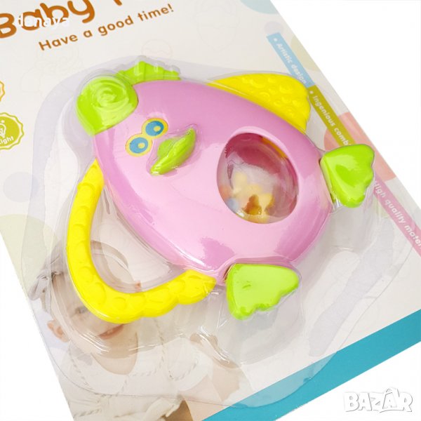 Бебешка дрънкалка с ярки и привличащи вниманието цветове. Дрънкалката е с форма на пиле. Жълтата част е гумена, което позволява да се използва и като бебешка гризалка.