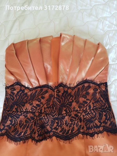 Бутикова, сатенирана рокля без презрамки. Има вградени подплънки и много кросиво бюстие. Размер S. Обличана е само за повод!