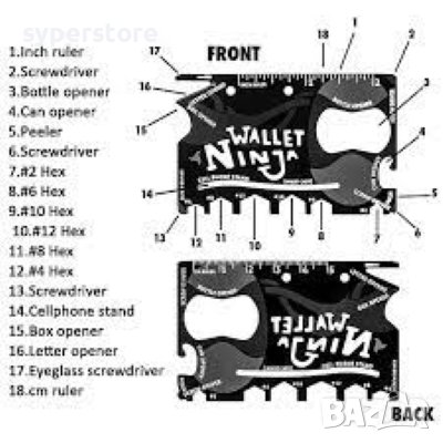 18 ИНСТРУМЕНТА В 1, ИНСТРУМЕНТ С РАЗМЕР НА КРЕДИТНА КАРТА - Wallet Ninja Multitool е вашият ежедневен инструмент, който лесно се побира в портфейла или джоба ви. Многофункционален инструмент, който функционира като отвертка, отварачка за бутилки, отварачка за кутии, отварачка за консерви, стойка за мобилен телефон, отвертка за очила, отварачка за бира, белачка за плодове, шестограмен ключ и теглич за пирони.