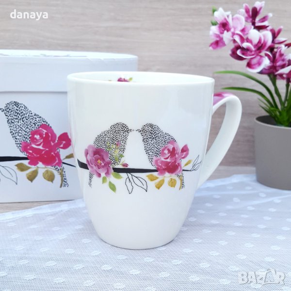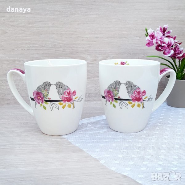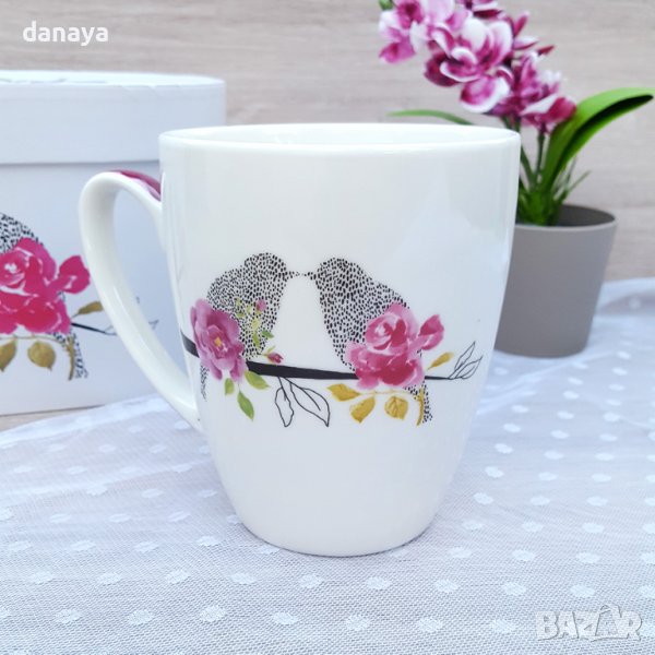 Подаръчен комплект от 2 броя керамични чаши в кутия. Чаши за чай за двама влюбени. Красив и стилен дизайн, с принт на кацнали врабчета и целуващи се, толкова романтично!….. Всяка чаша е с вместимост 400 мл. Прекрасен подарък за влюбени! Чашите се предлагат в красива картонена кутия с дръжка за носене.