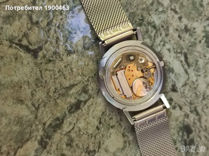Отлично работещ кварцов часовник.Диаметър без коронката 35мм с коронката 37мм.Жълт механизъм 7 камъка.Нова японска батерия.Нова стоманена верижка.Готов за колекция или носене.Произведен през края на80те години в СССР.Минск.