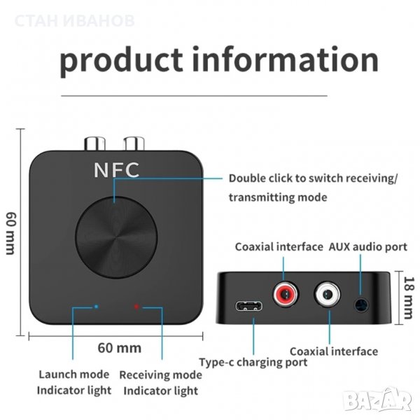 Аудио bluetooth приемник AUSEK BT-21, Безжичен, Bluetooth 5.0, 3.5mm AUX,