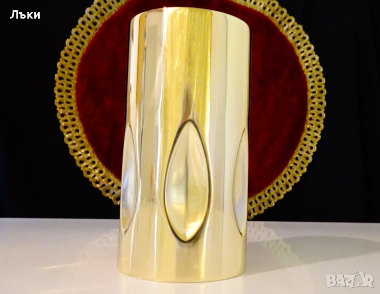 изработка от масивен високо качествен бронз с огледален златен блясък.Има ефектна релефна декорация.Маркиран от производителя.Височина 13 см.,диаметър 7 см.,тегло 260 гр.Вместимост 400 мл.