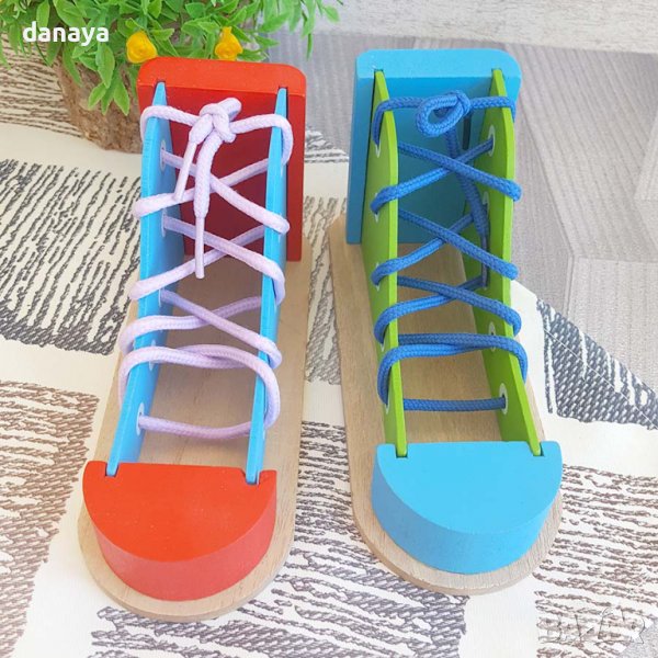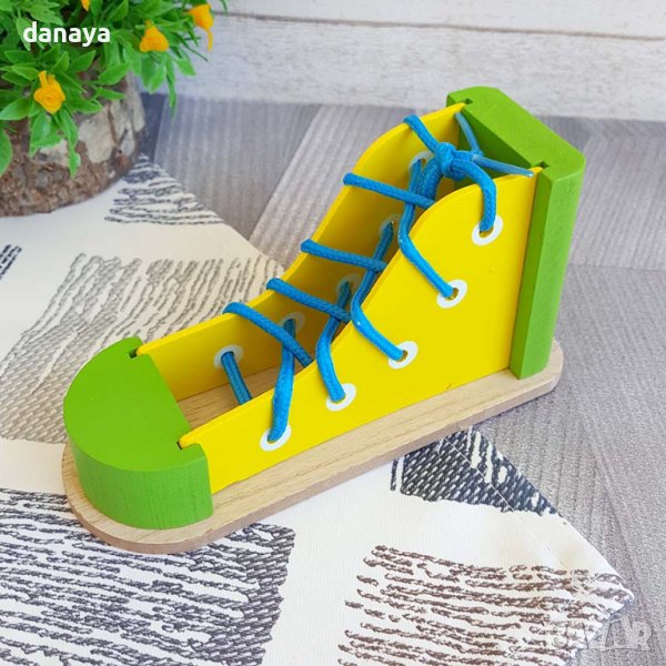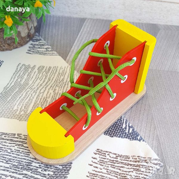 Обазователна дървена играчка обувка за връзване на връзки. С тази практична дървена обувка с цветен дизайн децата могат да се научат чрез игра как да завързват обувките си, да прокарват връзките на обувките през капсите и да връзват на панделка. През цялото време те ще тренират своето търпение и фина моторика.