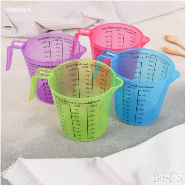 Кухненска мерителна кана в зелен, розов, лилав или син цвят. Измерва в милилитри и грамове. Кухненска разграфена каничка – отлична мерилка за лесно и точно отмерване на течности, както и грамажи, много полезна, особено, когато искате да сте точни в изпълнение на рецепти или питиета.
