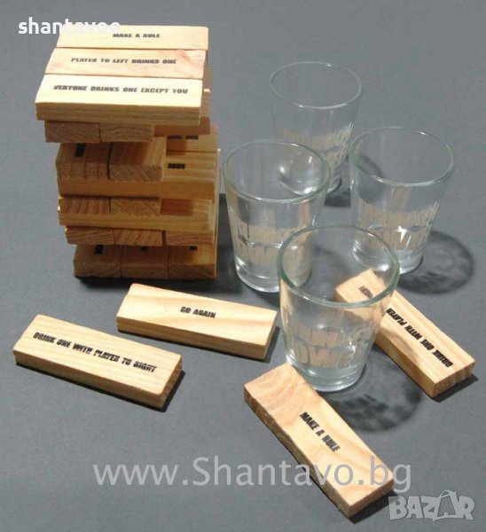 За да е по-интересна играта, на някои от блокчетата има надписи от долната страна. Надписите са от рода на: Drink one(Пий един шот), Choose a player to drink one (избери си играч, който да пие един шот), Everyone drink one except you (Всички пият по един шот, с изключение на теб) и т.н.