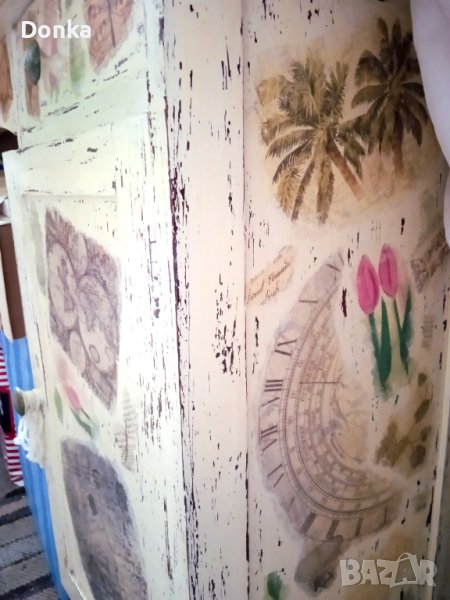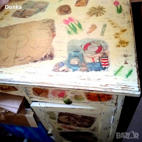 Старинно бюро от масивно дърво - размер на плота 100х60 см. Едно чекмедже, два рафта. Художник го превърна в единствен в света уникат в стил винтидж. В обявата е декларирано "ново", тъй като НЕ е ползвано след реставрацията и е като ново.