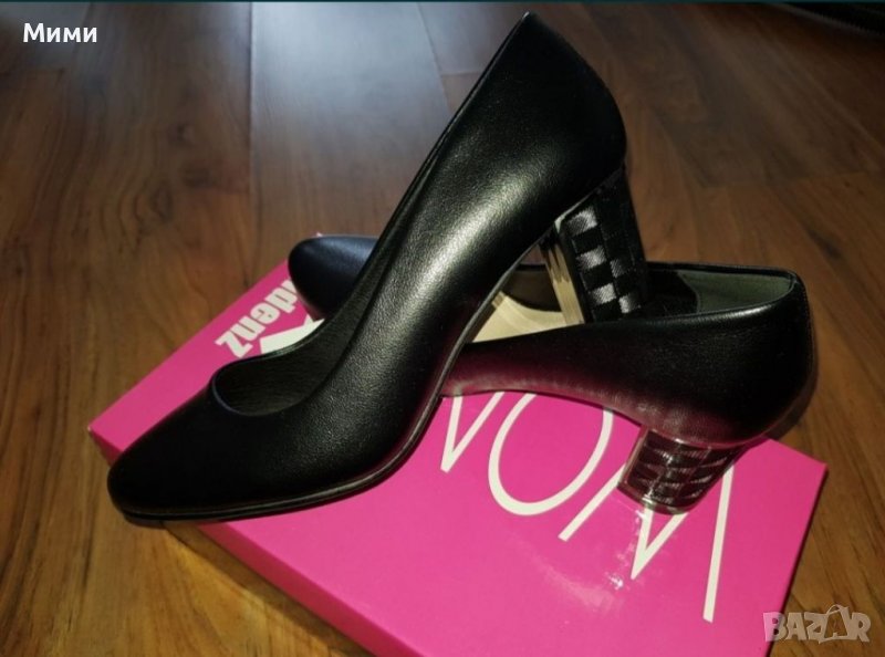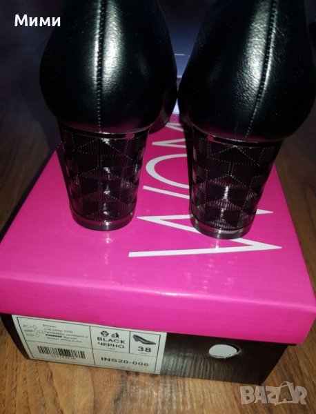 Дамски елегантни обувки в черен цвят, със стелка от естествена кожа. Височина на тока: 7 см. 38ми номер. Обувките са чисто нови, с немахнат етикет.