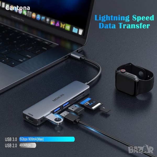MOKiN USB C хъб 6 IN 1 към HDMI 4K@60Hz, 2х USB 3.0, USB 2.0, SD/ TF
