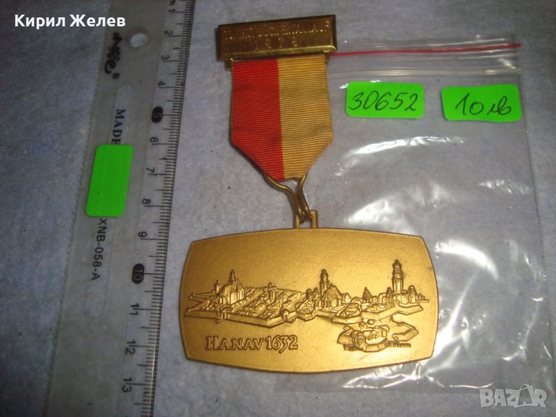 1979г. - ХАНАУ 1632г. ПОЗЛАТЕН БРОНЗОВ ПАМЕТЕН НЕМСКИ МЕДАЛ ИСТОРИЧЕСКИ с ЛЕНТА и НОСАЧ 30652