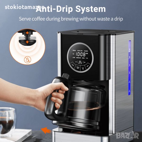 Кафемашина TaoTronics с 12 чаши, капкова кафе машина със стъклена гарафа, поддържане на топлината, 24-часов програмируем таймер, контрол на силата на варене, сензорно управление, система против капене, функция за самопочистване