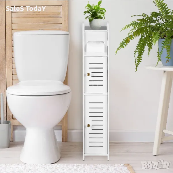 Функционален и практичен, като предлага достатъчно място за съхранение на вещи в банята. Белият цвят и изчистеният дизайн го правят лесен за комбиниране с различни стилове.Шкафът е тесен и висок, което го прави идеален за малки бани, където пространството е ограничено. Шкафът е специално проектиран за баня, като предлага място за съхранение на тоалетни принадлежности, почистващи препарати и други вещи.