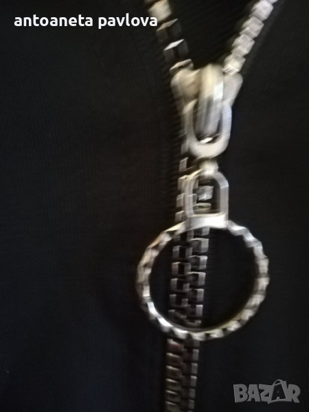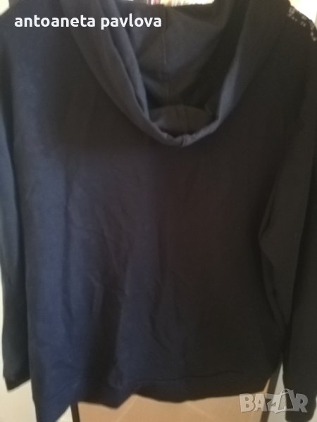 Спортно горнище в черен цвят с качулка Отпред е декорирано с две широки ленти с дантела гр ,Об 125см